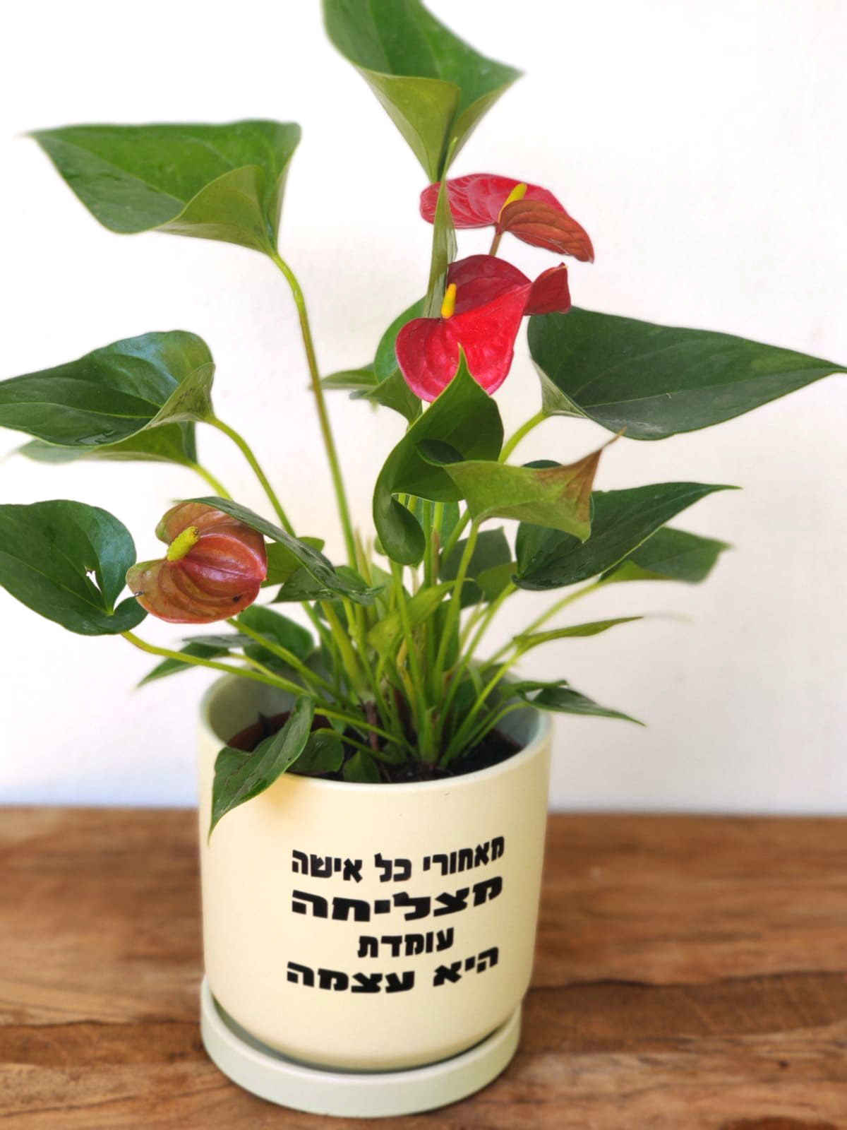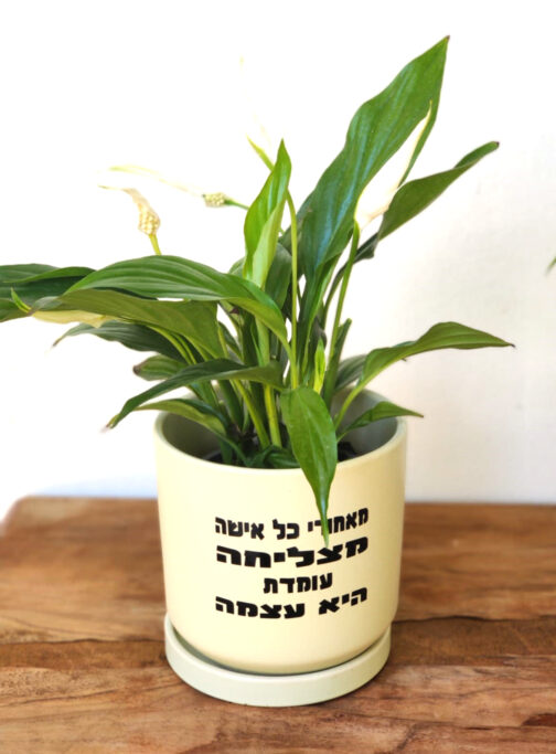 עציץ חרס קוטר 12 ס”מ עם תחתית, הכולל צמח והקדשה “מאחורי כל אישה מצליחה, עומדת היא עצמה”. מתאים ליום האישה, ליום האם, יום הולדת, למנהלת, למשרד, לחברה…